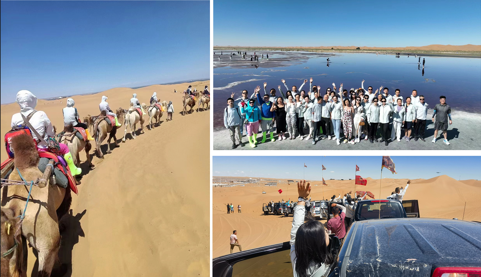 經過一番舟車勞頓后我們抵達了銀川住宿,之后為期五天的夢幻之旅都將以銀川為中心展開。當天下午我們就迫不及待前往了覽山公園,說到美景,很多人都會想到《羅馬假日》中的那輪落日和與之輝映的片片晚霞,這里也有。落日是同樣的落日,晚霞是同樣的晚霞,但與意大利的古典浪漫不同,這里充斥著東方所特有的婉約與雄壯,我該怎么讓你相信,寧夏絕對不止沙漠而已。在酒店洗刷一天的疲憊后第二天我們來到了沙湖景區。進入景區大門,首先呈現在我們眼前的是一眼望不到頭的湖水,湖上時不時還有各種鳥類飛來飛去,好不快活。接著我們乘船穿過碧波蕩漾的湖面和一大片茂密的蘆葦蕩,“沙鷗翔集,錦鱗游泳。岸芷汀蘭,郁郁青青”《岳陽樓記》中的這段描寫用在此處再合適不過。在賀蘭山下,我們參觀了現存規模最大、地面遺址最完整的帝王園陵之一——西夏王陵,歷史的滾滾洪流早已將《滿江紅》中“踏破賀蘭山闕”的“壯懷激烈”沖刷干凈。今天的西夏王陵博物館、三號陵僅僅只是一個景點,一個向大家介紹民族文化的地方。第三天的旅途集中在沙坡頭景區,沙坡頭景區北接騰格里沙漠,南臨黃河,在這里我們即可效仿古人感受駱駝騎行,也可體驗沙海沖浪,這樣的經歷讓人一輩子忘不掉了。寧夏以曠野聞名,綿延起伏的沙丘,讓你看見大自然呼吸的節奏,但寧夏也絕對不止于曠野,在“天下第一索”上盡情的吶喊,在黃河最古老的運輸工具羊皮筏子上唱著山歌,在中國最大的天然滑沙場上盡情滑下。銀川將她獨特的魅力盡情的展現給世人。第四天我們來到了阿拉善盟,這也是“五湖的所在地,在這里我們體驗了“五湖穿越”。第一站是烏蘭湖,緊接著是駱駝湖、蛋黃湖、天鵝湖、吉他湖。沖浪車在沙漠高低起伏的山丘中不斷的上坡急停,沖上沙脊而后俯沖沙谷,其中充斥著沙漠越野車的狂野與刺激。