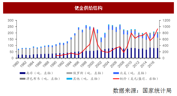 鈀金的供給主要由礦山生產與催化劑回收組成??傮w而言,在2002 年以前,隨著鈀金的價格不斷上漲,鈀金供給也在節節攀升;在2001年,互聯網經濟泡沫破裂后,鈀金價格驟降,鈀金的供給逐漸變得平穩。在2005年之后,隨著新興經濟體尤其是中國的強勢發展,帶動了汽車業的蓬勃發展,鈀金的價格也在逐年上漲,供給量穩步提升。近年來,鈀金價格在礦山產量回落的影響下,趨于平穩。