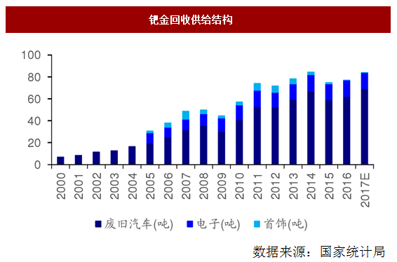 從鈀金的回收而言,主要分為汽車尾氣催化劑回收與電子回收,首飾回收只占很小一部分。對于催化劑回收和 電子回收而言,兩者在近年來都有增加,特別是催化劑的回收。隨著經濟的發展,全球汽車數量逐年增長,汽車的報廢量也會相應增加,這樣可以拉動回收企業產量的上升。對于回收廠商而言,由于回收成本相對穩定,鈀金價格的上漲極大地刺激了他們的生產意愿。而近幾年,全球對于環保政策的嚴控,對于汽車尾氣催化劑的要求越來越高,不合規的車輛也越來越多。