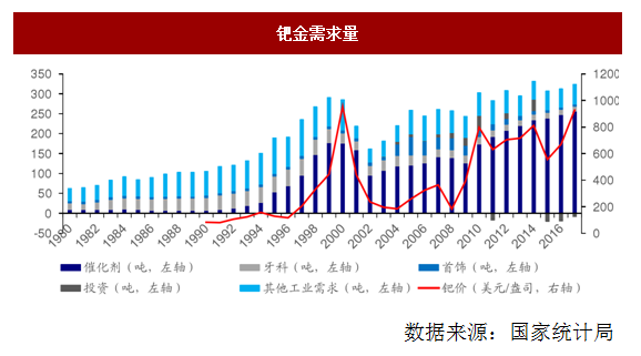 鈀金的需求主要是催化劑,自上世紀90年代,由于鉑價不斷上漲導致作為替代品鈀的需求大幅上漲,也推升了鈀金價格。雖然為貴金屬,但是鈀金的工業屬性很強,鈀的價格主要與其工業需求相關。2009年全球經濟逐漸復蘇,隨著環保標準的提高,對于乘用車的需求不斷擴大,鈀的需求量逐年攀升,鈀價也隨之上漲。我們認為,伴隨著全球汽車銷量的擴大,鈀的需求量可繼續上漲,特別需要指出的是,中國的尾氣催化劑主要用鈀金,自2013年開始,中國提高了汽車尾氣催化劑的排放標準,在此背景下中國鈀的需求可望有較大的上漲。