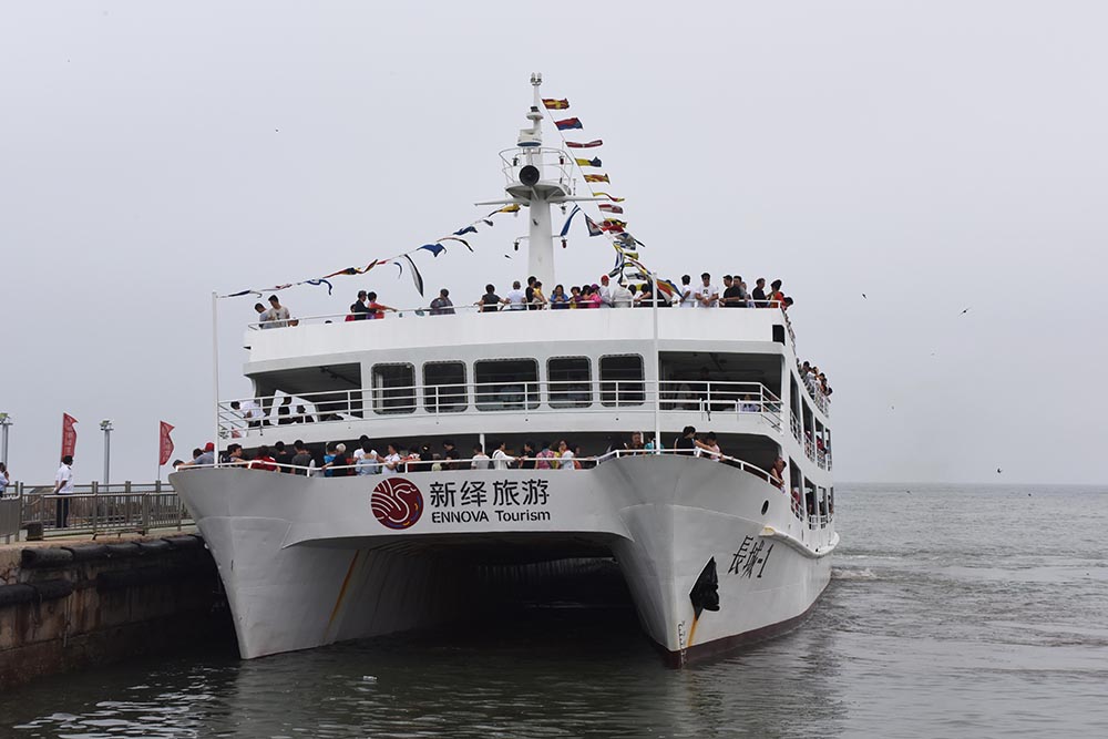 第二天 在秦皇島,漫步海浪之中的愜意自然 這一天是舒適的自由行,大家可以自由安排旅游時間、地點,去逛想去的地方,我們三五成群,相約一起去乘坐著名的景觀游船長城號。到了碼頭發現人真多呀,碩大的船只載著滿滿的乘客,乘風破浪于海上,我們登船的激動心情溢于言表! “長城”號游船是一艘近海兩首雙體船觀光客船,當乘坐此船時會感到非常地平穩、寬敞和舒適。隨著汽笛聲響,輪船漸離碼頭,浪花在船邊翻滾,激起數丈,偶爾會落到您的臉上,清爽愜意油然而升。拋在身后的兩條扭動的長長的白鏈,有如在原野上被犁起的土地一樣,這就是有名的“雙鏵犁海”。站在船頭任由海風吹拂,一切的煩惱憂愁拋置腦后。偶爾有海鷗鳴叫著從頭頂急速滑過,隨浪花跳躍的魚蝦與我們同行。