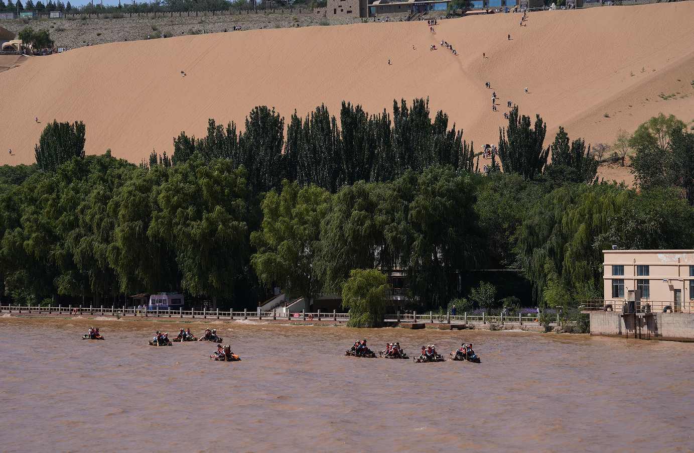 第二站中衛沙坡頭,這里是黃河與沙漠相遇的地方。坐著羊皮筏子,聽著筏工師傅們唱著西北民歌順流而下,感受破濁浪過險灘的緊張與刺激。站在沙坡頂端,黃河奔騰而過,氣勢磅礴。滑沙而下,感受著風在耳邊呼嘯,刺激無比。騎上駱駝,在沙漠中漫步,仿佛成為了一名古代的商旅,“絲綢之路”就在腳下。夕陽西下,沙漠被染成了金黃色,美不勝收。